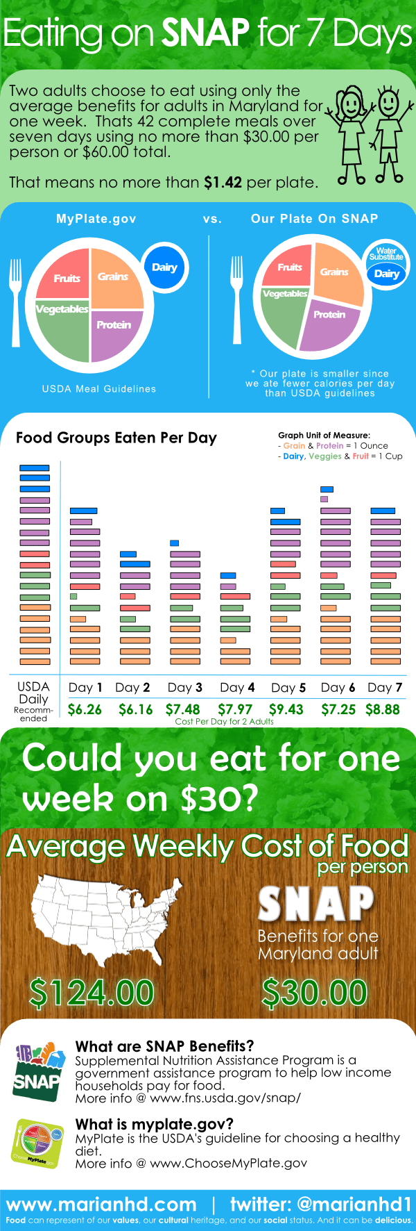 For those of you without enough time to casually peruse my week-long journey on a SNAP budget as chronicled here on marianhd.com, I have summarized it for you in one handy post, and with one handy infographic.  Here you will find what we learned, and how we did nutritionally and financially.  Enjoy!