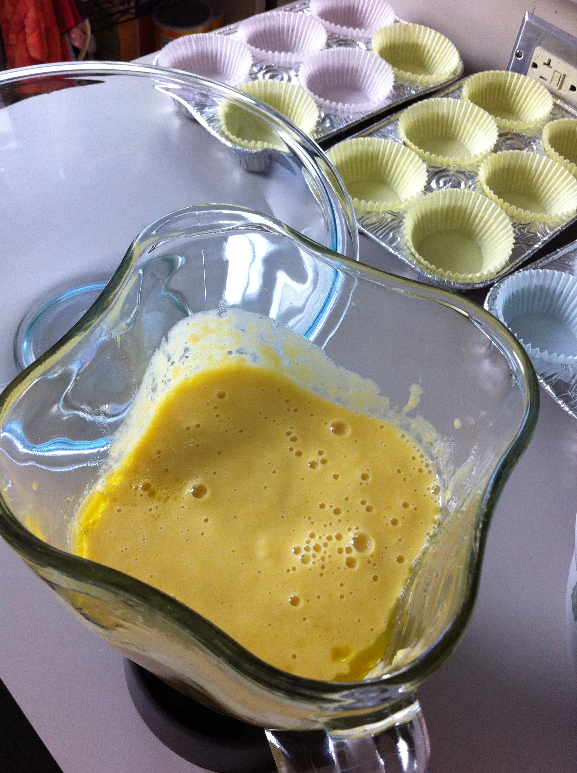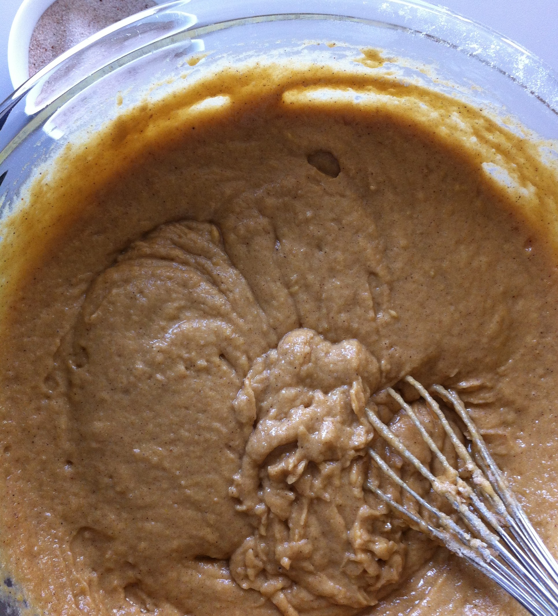 I gathered all the ingredients to start (click the photo for a better view of the goods). Then I prepared the pumpkin. After roasting, I had removed the flesh from the skins and just stored it in a plastic container in the fridge. The flesh was still lumpy and needed a good run through the blender to be muffin-worthy. While I was at it, I threw in the eggs, oil, and applesauce. If you were using canned pumpkin puree, you can skip this. To the puree I added the sugar, spices, baking soda, baking powder, and salt. I changed the order of ingredients in my version of the recipe below to reflect the more typical method of mixing a quick bread batter.
