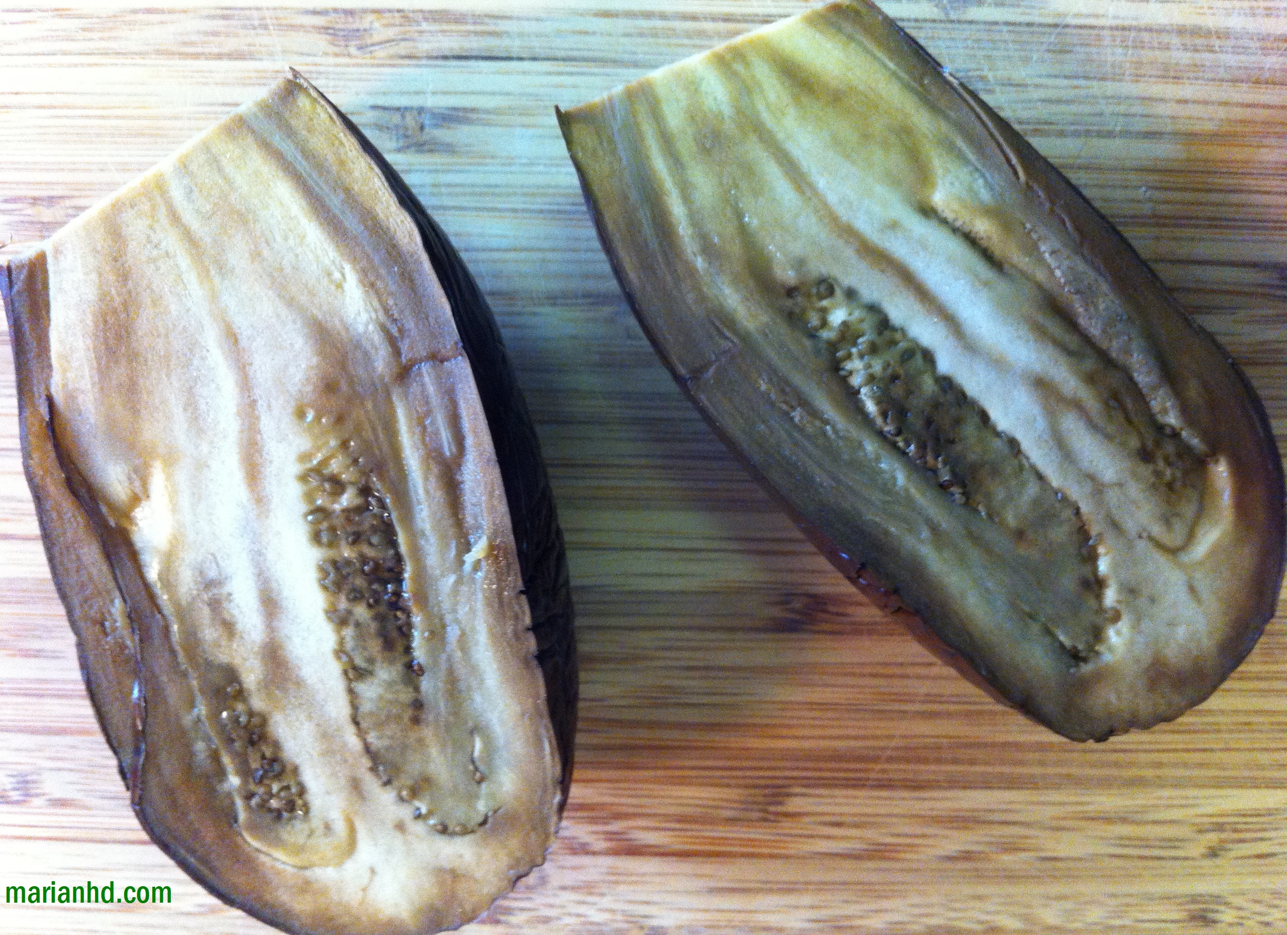 1. Pierce and roast the eggplant in a 430 oven for about 30 minutes for a small one (closer to 40 minutes if using a regular size one) or until the eggplant appears a little charred. If you are feeling very talented, toast the eggplant over a naked flame until the outside looks a little charred. I put mine on a piece of foil in the oven.