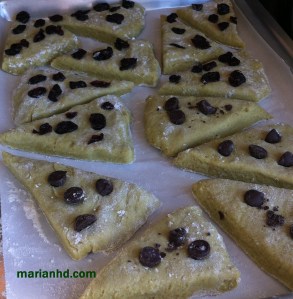 6. Arrange the slices onto the cookie sheet, leaving some space between scones. Bake for 10-12 minutes, or until the bottoms are slightly browned.