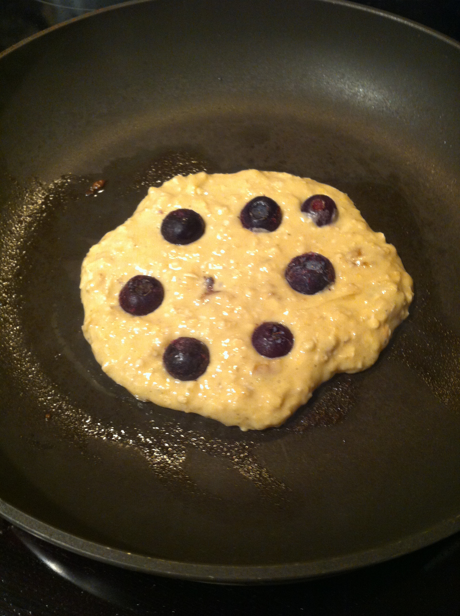 5. When the skillet is hot, spoon about 1/4 cup of batter in the skillet and spread it out to make it thinner. Drop the blueberries onto the pancake. When the edges have set, check the underside and if golden, flip the pancake to cook the other side. Repeat with the rest of the batter.