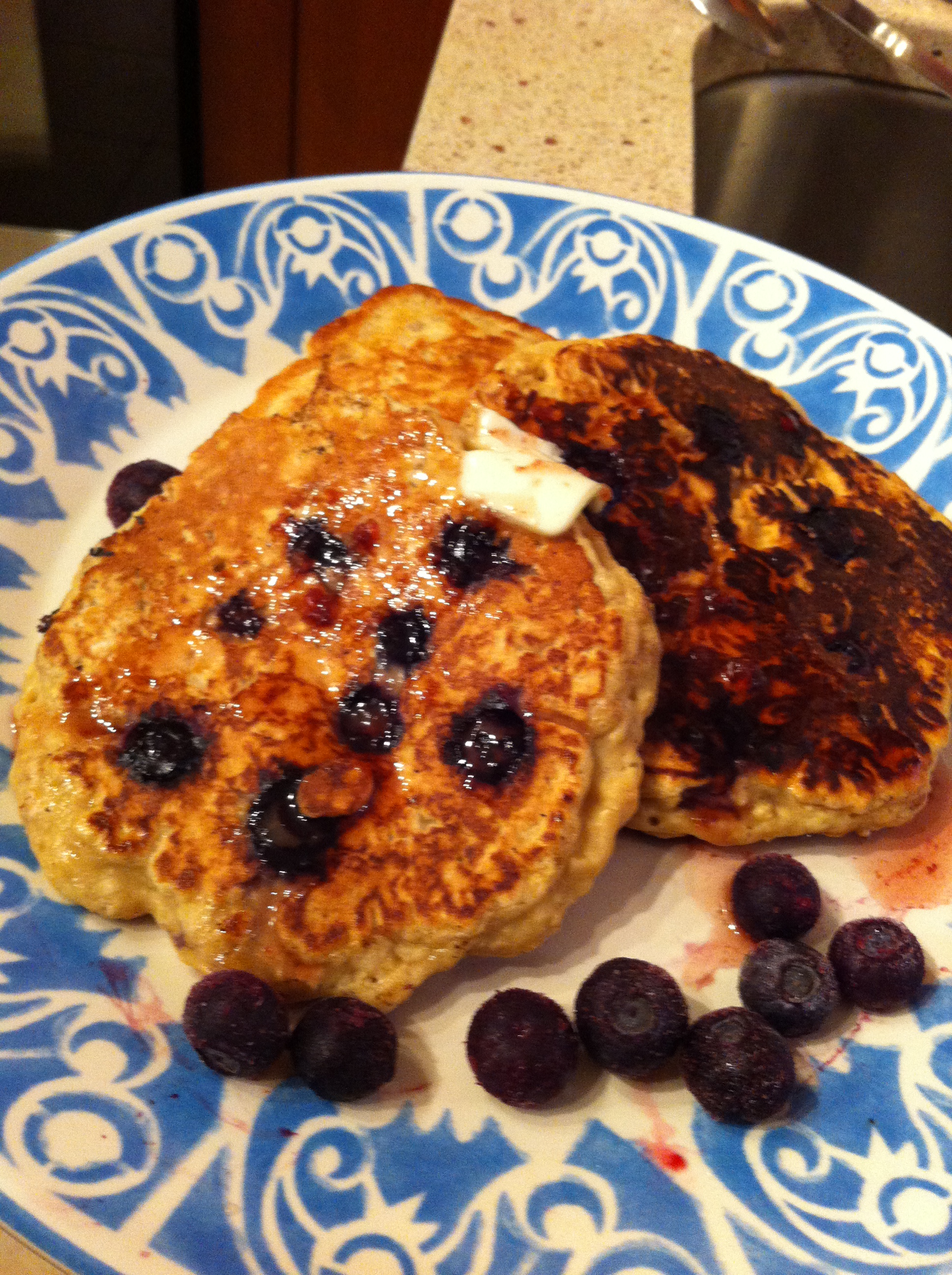 Life in the marianhd household is quite different. But when I wake up early to an empty house on a Saturday morning, I still want pancakes. I shuffle into the kitchen, make coffee, and strategize how I can get pancakes on a plate the quickest and easiest. I don’t have any of my cookbooks handy, and the laptop is all the way in the other room. Then a lightbulb! I flashed back to a morning in Northern Ireland when my friend and I wanted pancakes, and I nearly stopped us because “I don’t have a recipe for pancakes” but my wise friend responded with, “It can’t be that hard. We’ll just make it up!” We made it up, and they were delicious! Maybe they weren’t as fluffy and light as Alton Brown’s, but with syrup and butter, they tasted just as good.