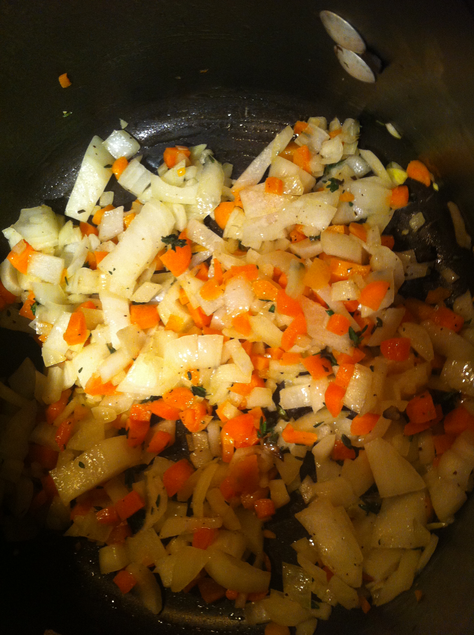 2. Reduce the heat to medium and add the remaining Tbsp of olive oil. Add the carrots, onion, thyme, salt and pepper and cook for 5 minutes or until the onion is starting to brown. Stir every once in a while as you prepare the next step.