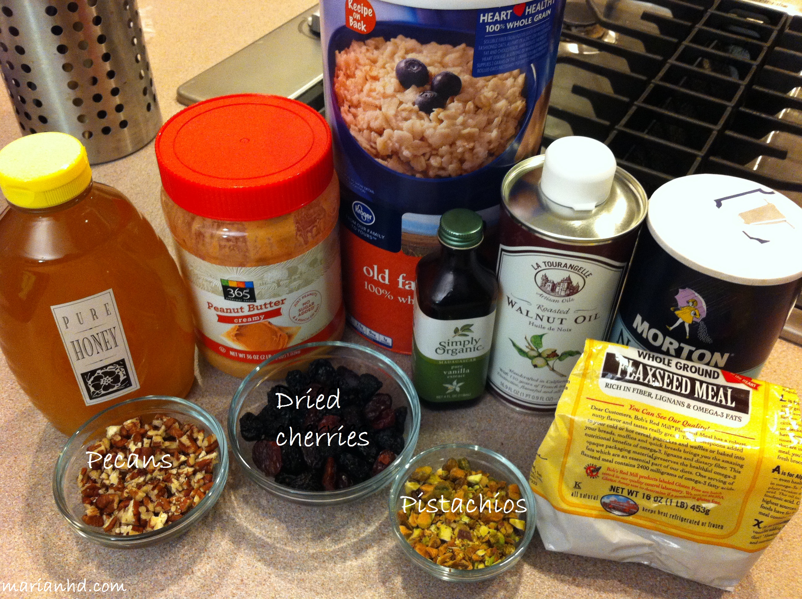 2. In a bowl, combine oats, cherries, flaxseeds, pecans, pistachios, and salt.