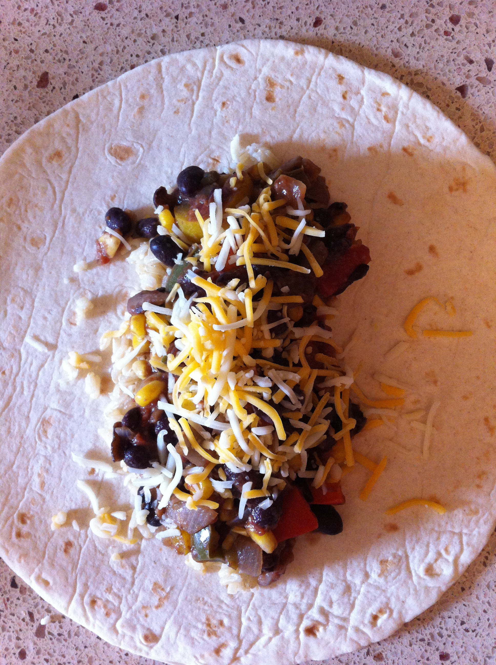 You’ve heard of those shows, right? Folks who are convinced the world is going to end due to [fill-in-the-blank catastrophe] and the only ones who will survive are those who have a sealed bunker with meals-ready-to-eat, bottled water, and plenty of ammunition, etc. My favorite was the one who was learning to make his own wine with the expectation that in the future alcohol would be the new currency when the US dollar loses value. (Given the coming wine shortage, he might be on to something). This week has been my prepping week. I’m not concerned about the end of the world, I’m concerned about leaving the husband alone for a week. The last time I was out of town for a week, he conveniently scheduled a trip out of state to visit family. I secretly think he didn’t want to have to feed himself for a week. I’ve spoiled him with my cooking and created a dependency. We’ve stocked up on cereal, peanut butter, bread, oranges, and baby carrots. The husband anticipates a crazy week of work, and intends to subsist on sandwiches. But I want him to have some hot options, too. The perfect solution is frozen burritos. I love easy meals that can be pulled from the freezer and be ready in under 10 minutes. The husband reminded me of my single-girl day interpretation of this love with my Lean Cuisine-filled freezer. Guilty. But the new me strives for fewer preservatives and more homemade food while still providing convenience. These burritos fit the bill. The recipe is inspired by Martha but adapted to provide more veggies to help us meet our daily dose! It has become a household favorite for the husband and me. They make the best lunches, especially if you can add some fresh avocado!