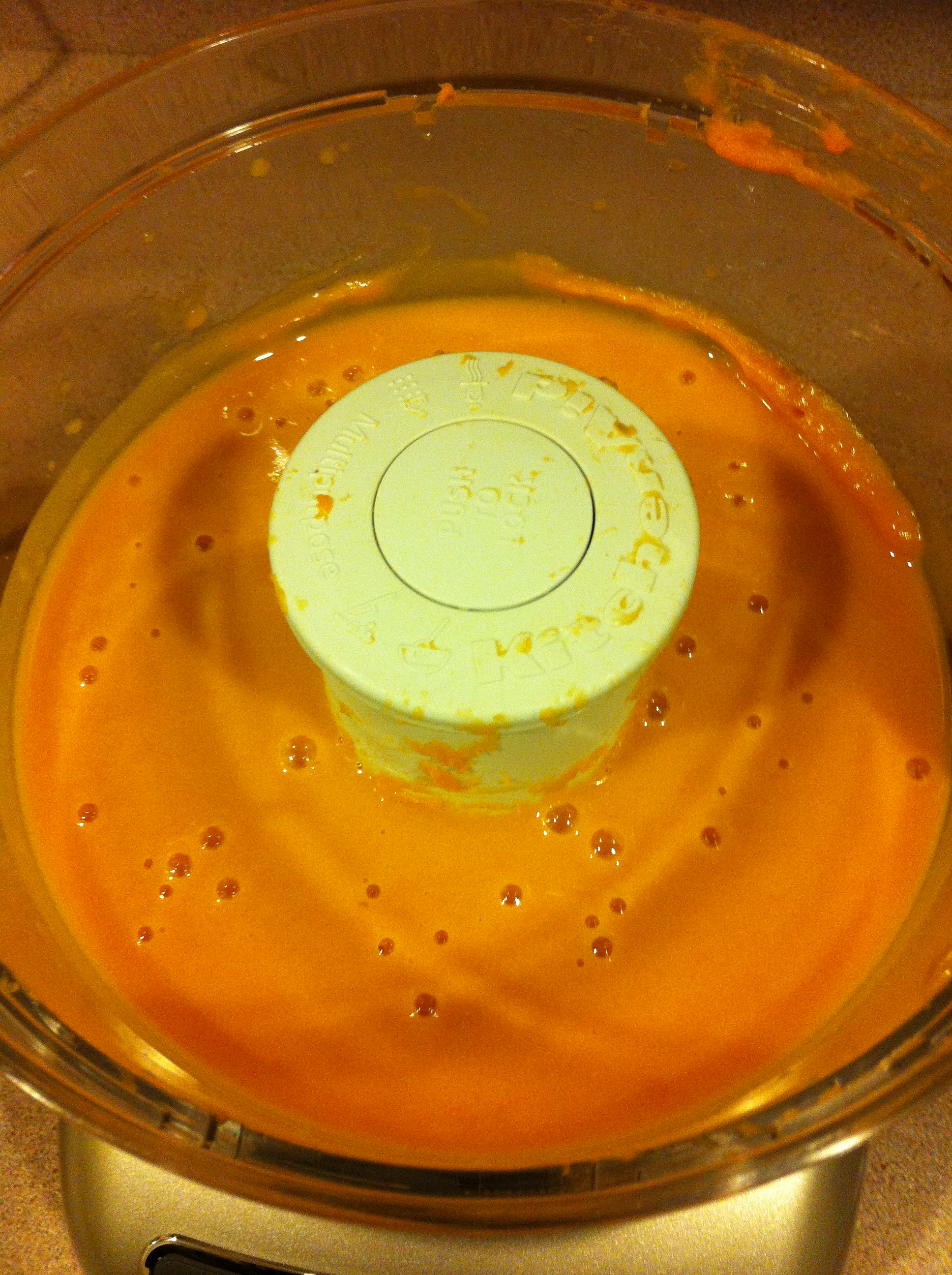 1. Make your sweet potato puree: either bake the potato in a 400 degree oven for 1 hour; microwave for 4 minutes, flip and microwave for 4 more; or peel, dice, and boil in salted water. Allow the potato to cool and then puree with a food processor. If you don’t have a food processor, mash with a potato masher or a hand mixer.