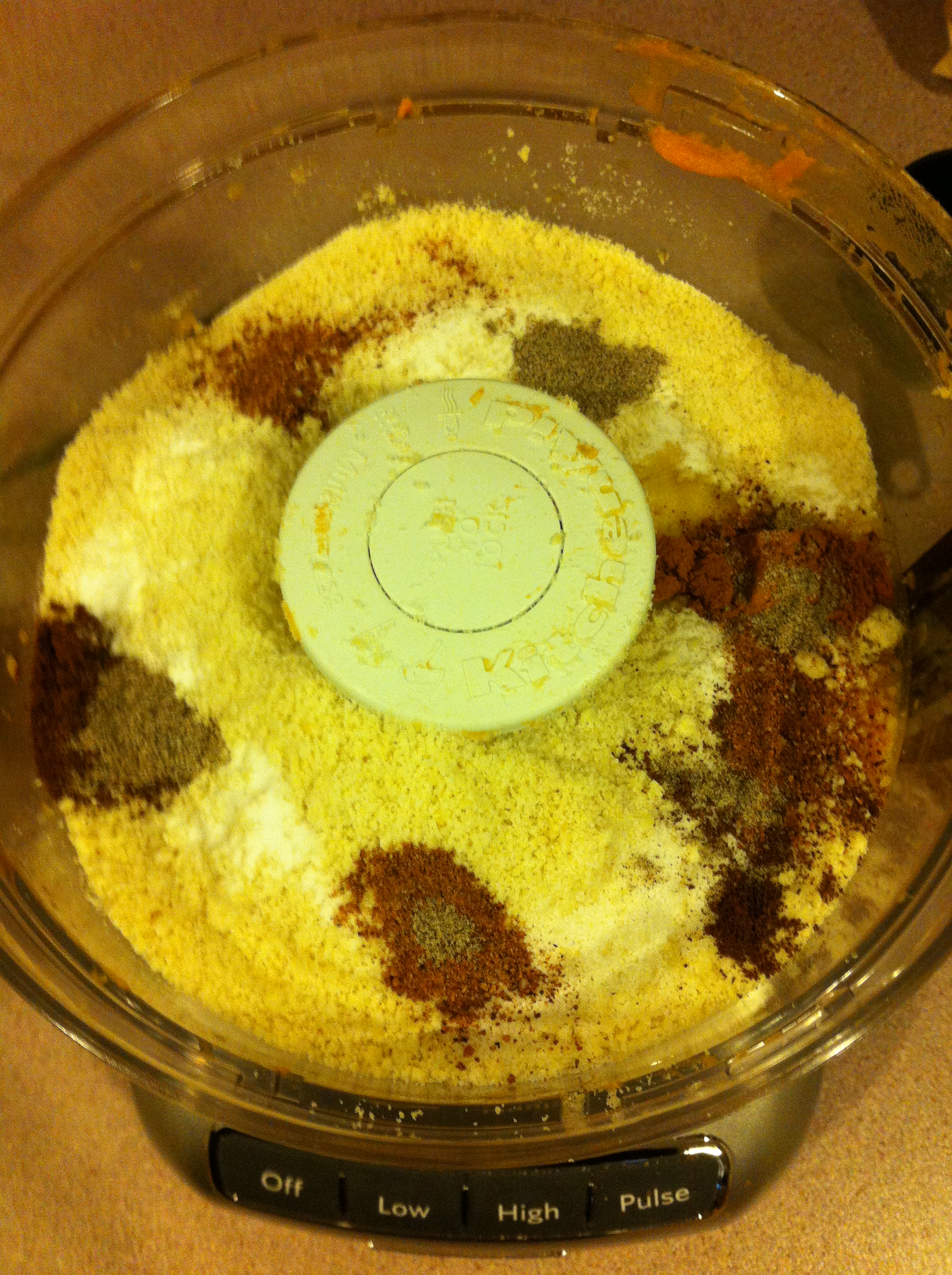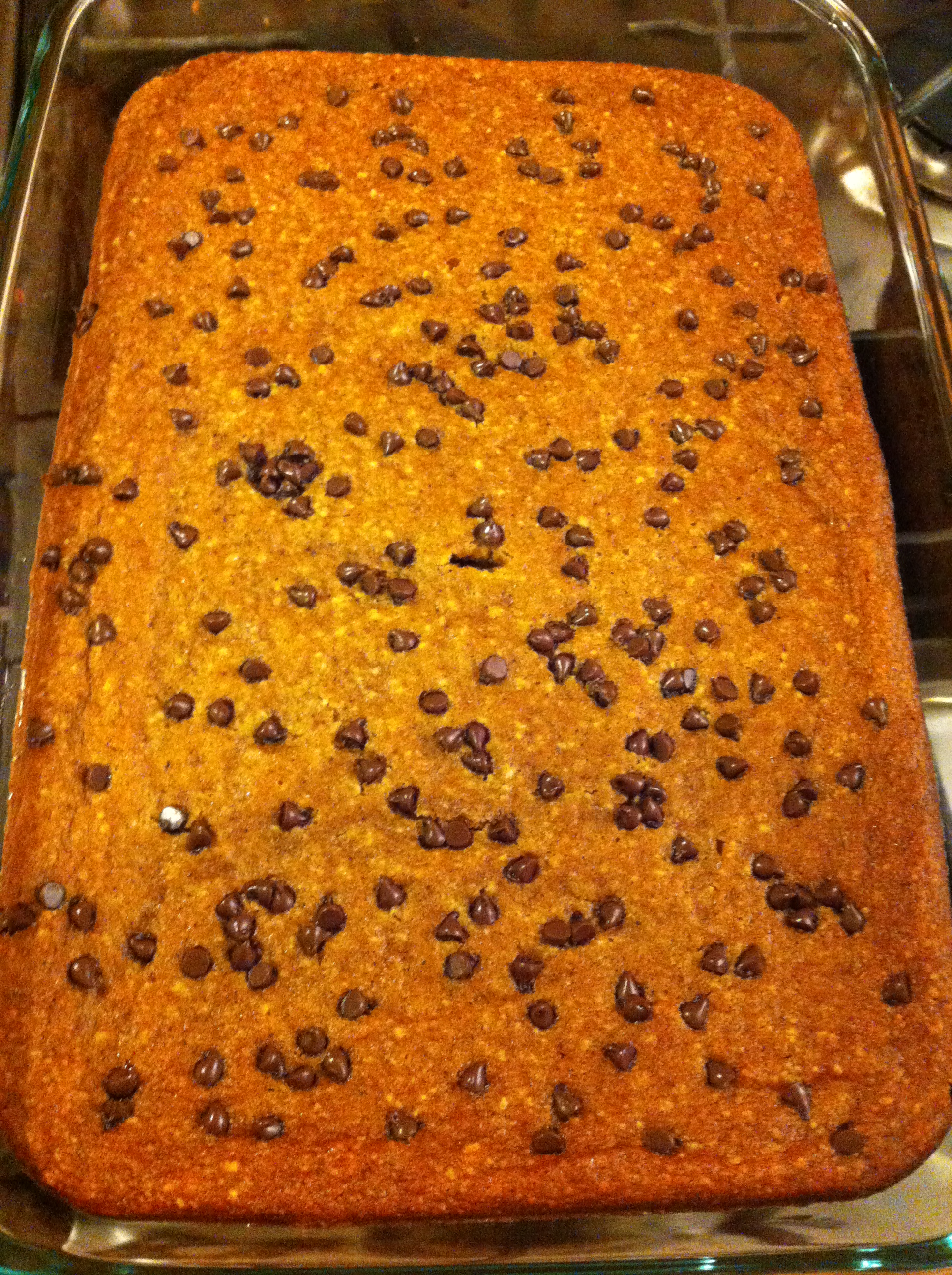 2. Preheat oven to 350 degrees. Grease a 9x13in baking dish. Combine sweet potato, honey, and eggs in a food processor or mixer (or in a bowl by hand). Add the rest of the dry ingredients except chocolate chips and stir until combined.