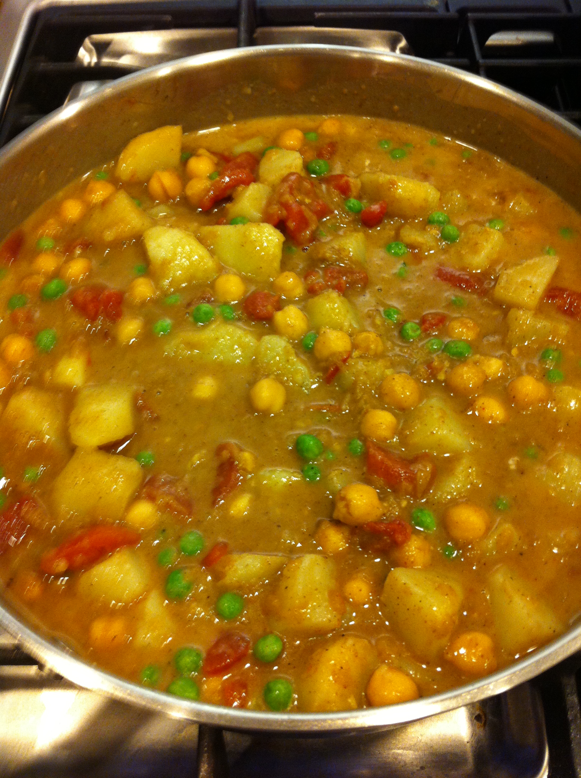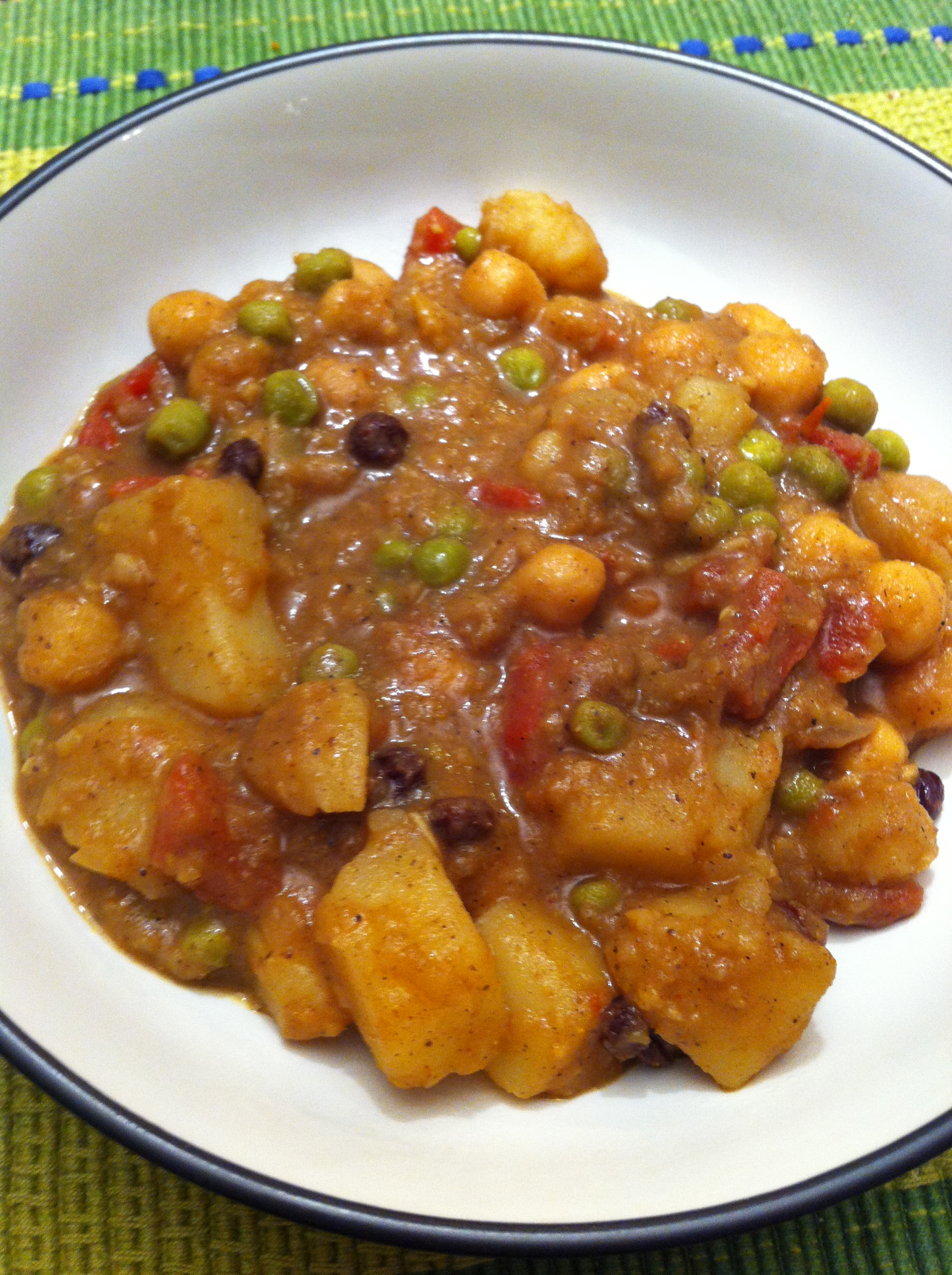 2. While the potatoes are cooking, heat the oil in a large skillet over medium heat. Add the onion and garlic and cook for about 5 minutes, or until translucent. Add the cumin, cayenne pepper, curry powder, garam masala, ginger, and salt. Cook for 2 minutes more. Add the tomatoes, garbanzo beans, peas, and potatoes. Add the coconut milk, dried fruit, and cashews (if using) and bring to a simmer for 5-10 minutes. Serve with some naan if you can find it in your grocery store. I found that biscuits were an acceptable substitute.