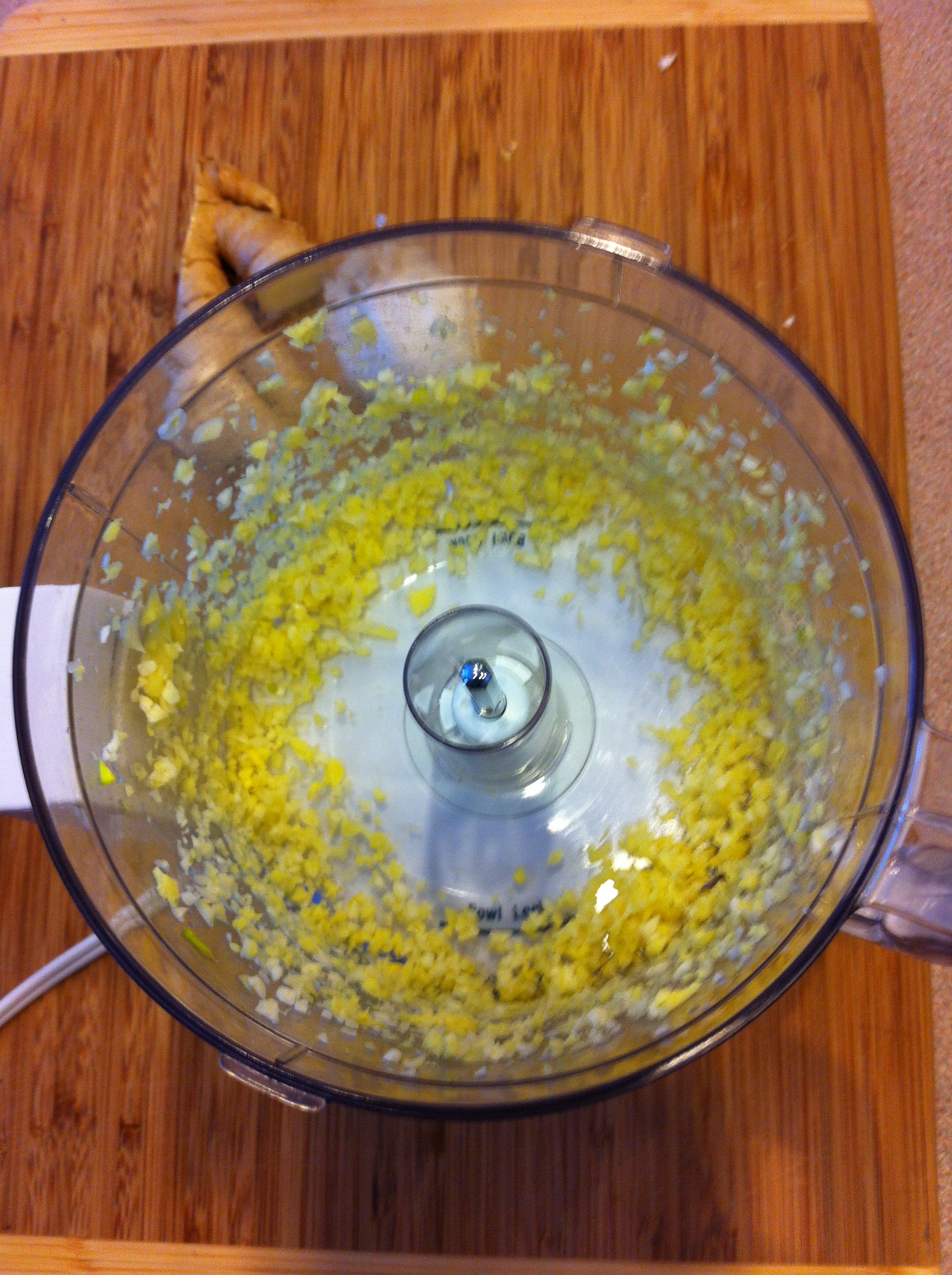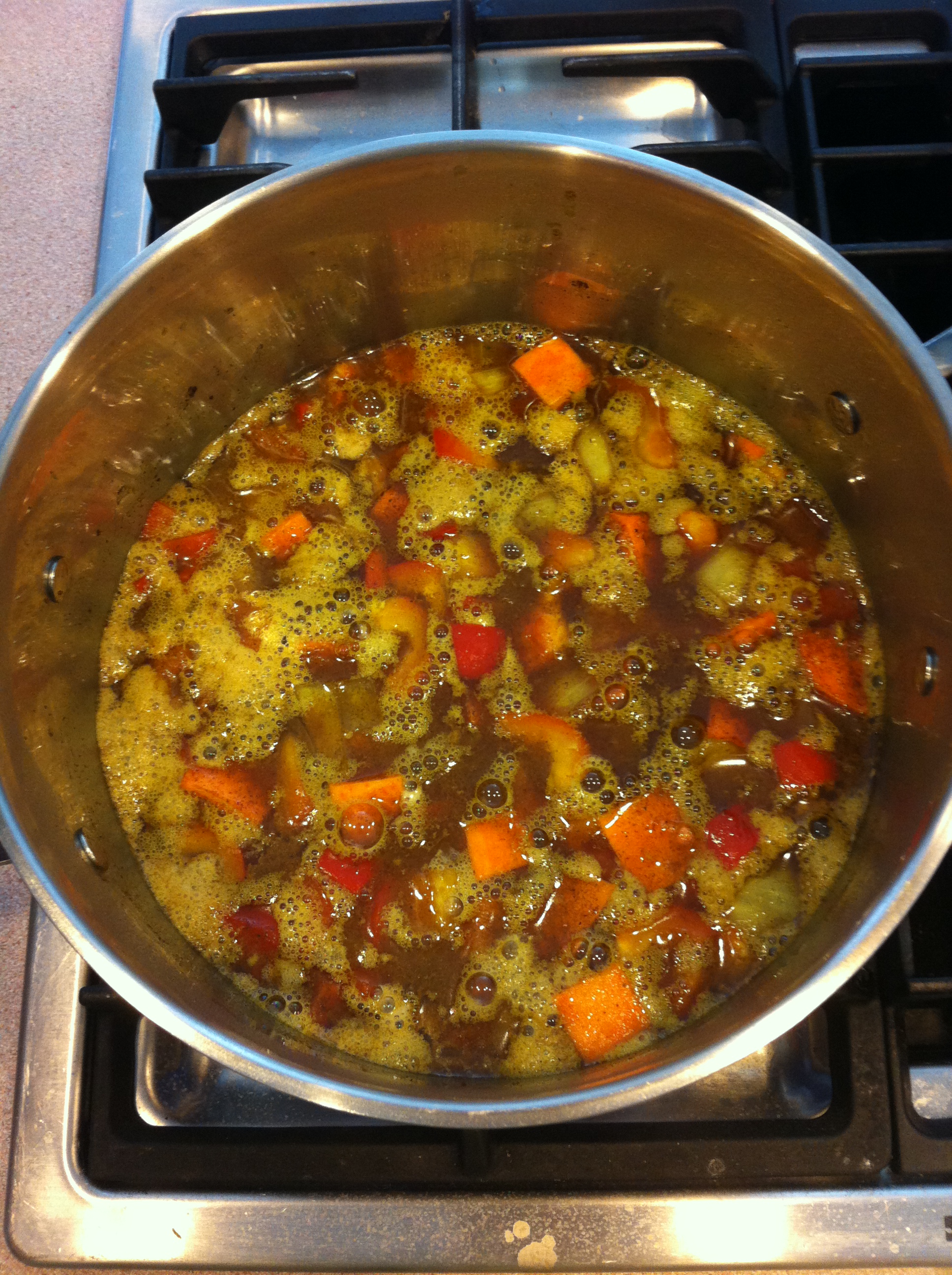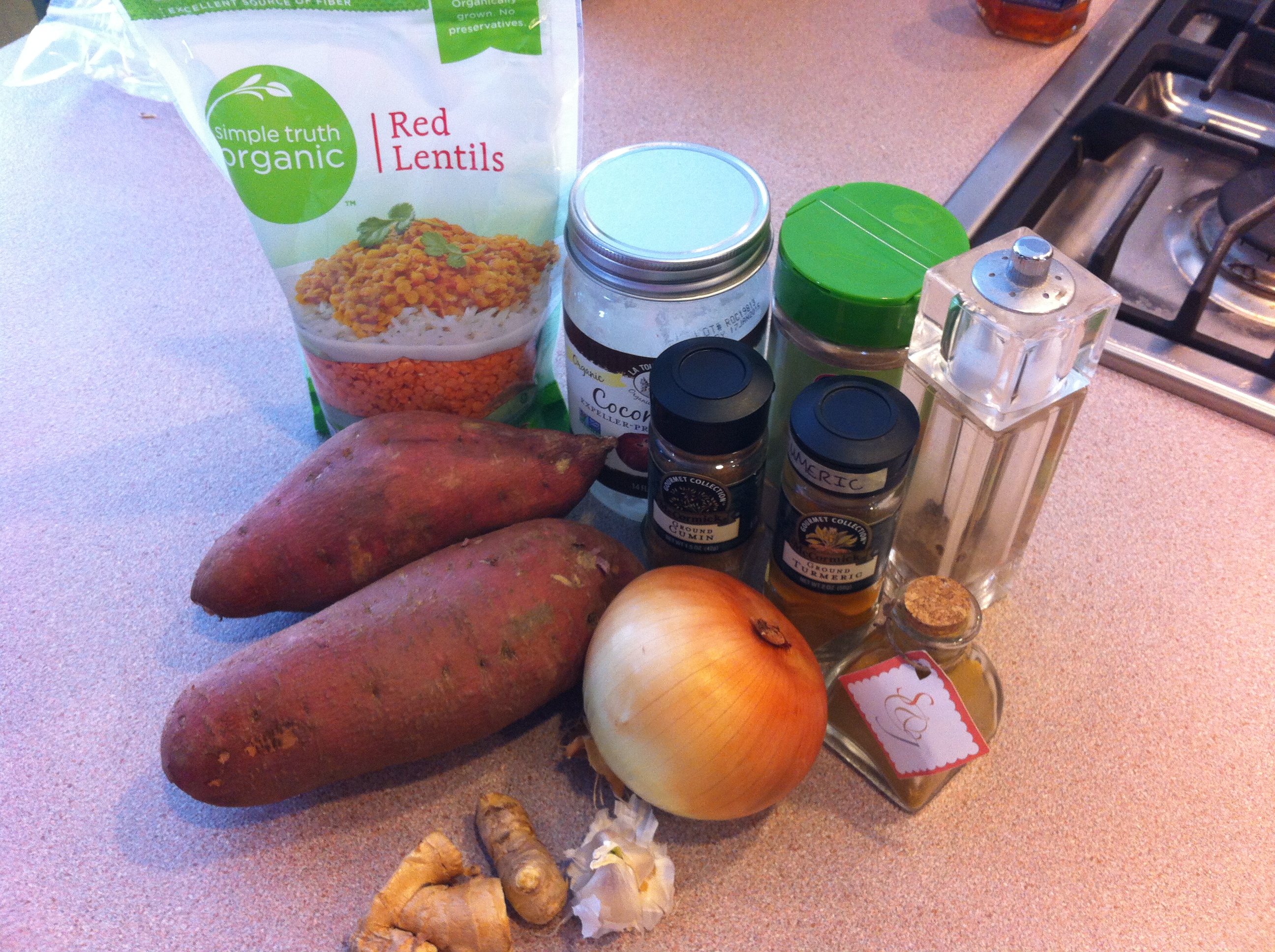 1. Dice the onion, mince the garlic and ginger (a small food processor is AMAZING for this), peel and dice the sweet potatoes, and dice the red pepper.