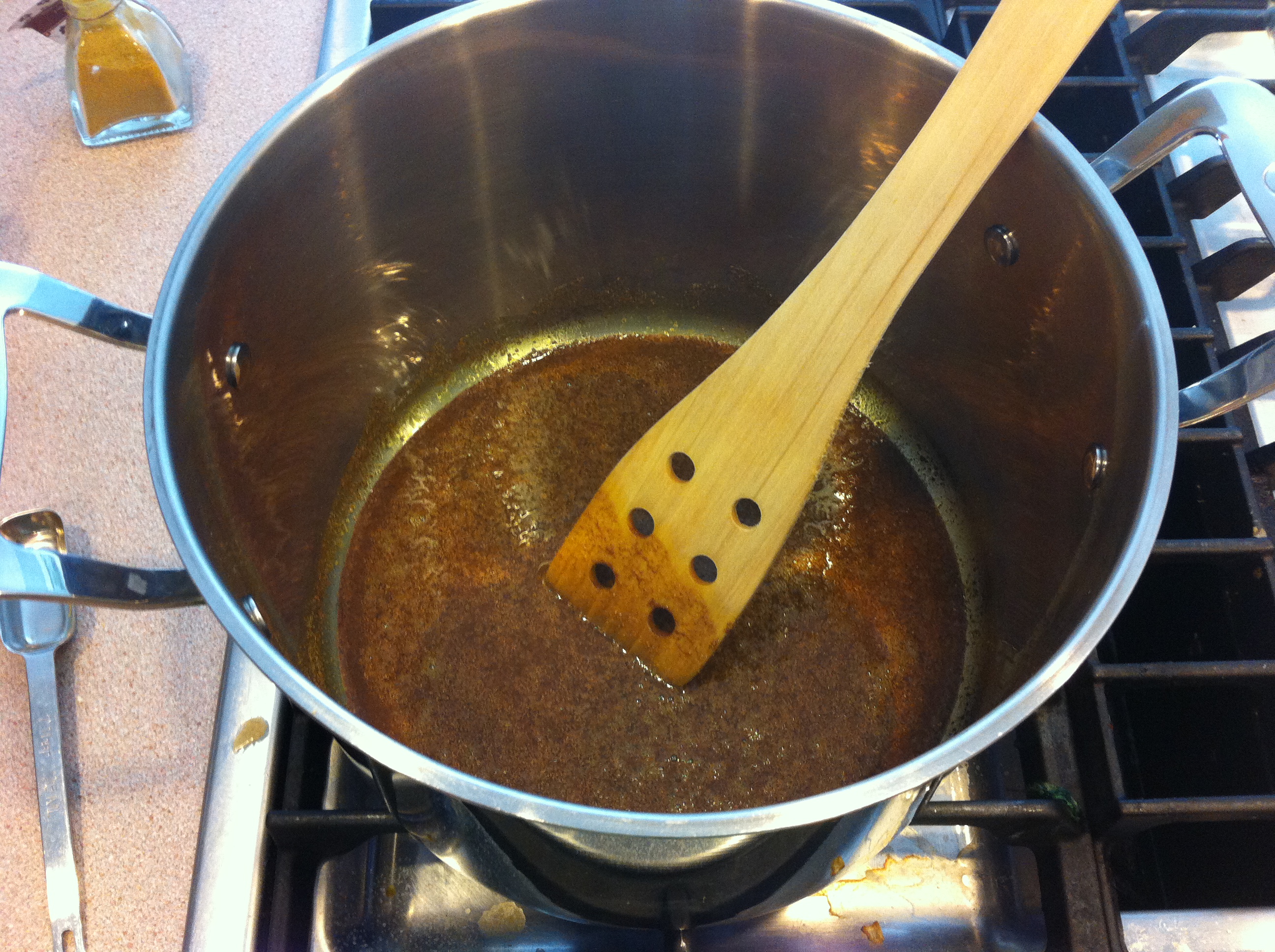3. Stir in the ginger and garlic and cook until tender, about 2 minutes. Add the sweet potatoes and red pepper and cook for one minute. Everything should be covered in the spice mixture and it should smell amazing already.