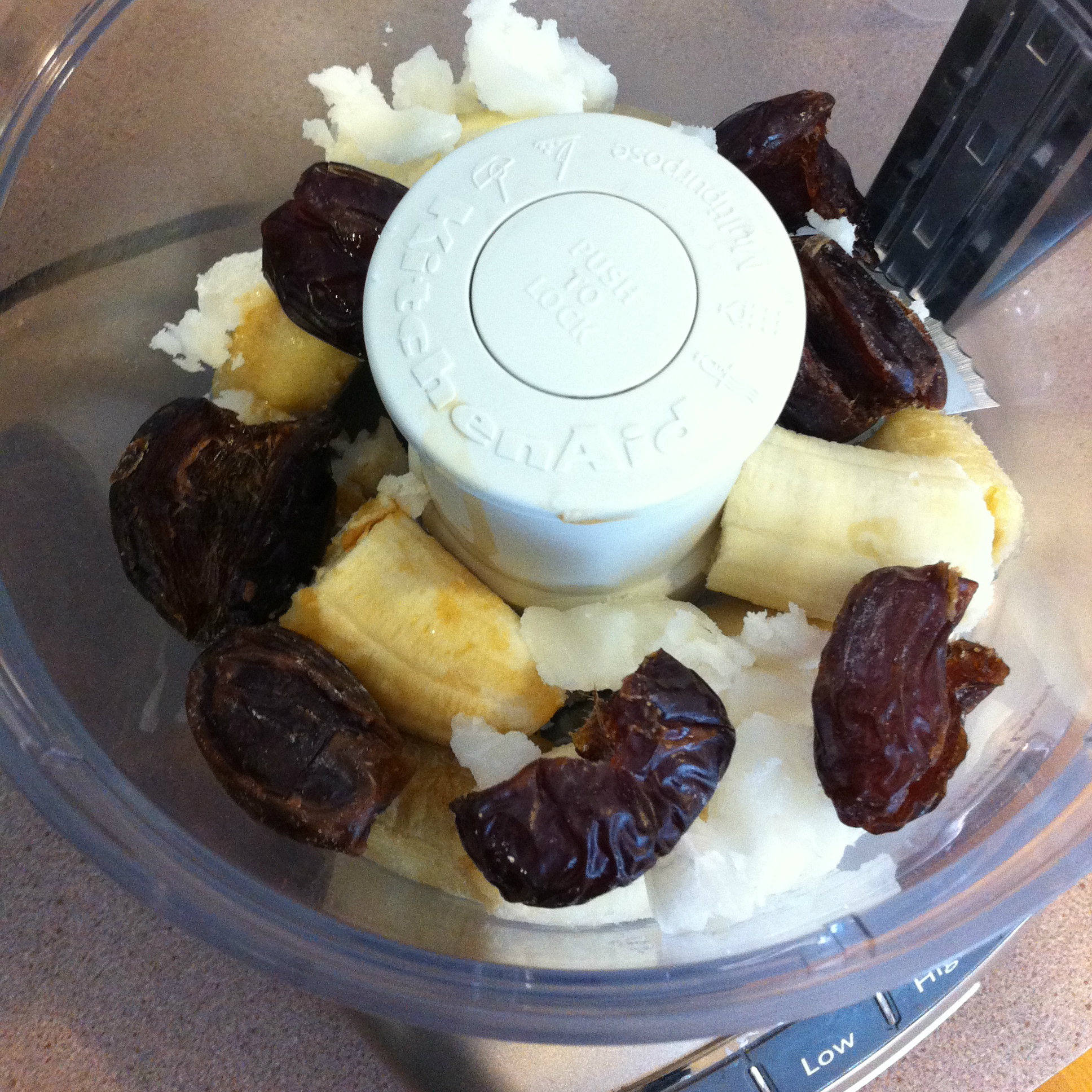 2. Using a large food processor, combine the bananas, dates, coconut oil, and vanilla extract.  Process until the mixture is smooth.  This will take longer than you imagine it will.  Don’t be afraid to let the processor run for over a minute.