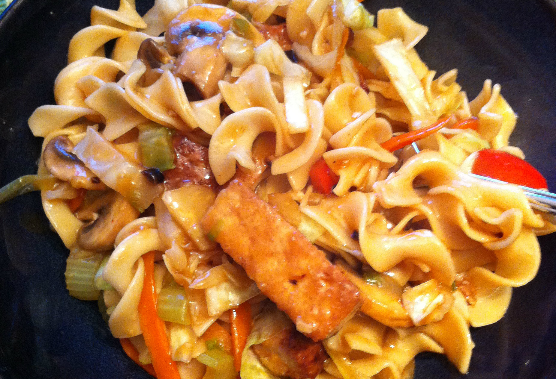 5. While the veggies are cooking, whisk the cornstarch into 2 tbsp of cold water and then add to the sauce mixture. Add the sauce to the veggies and bring to a simmer, then add the noodles and tofu, and serve!
