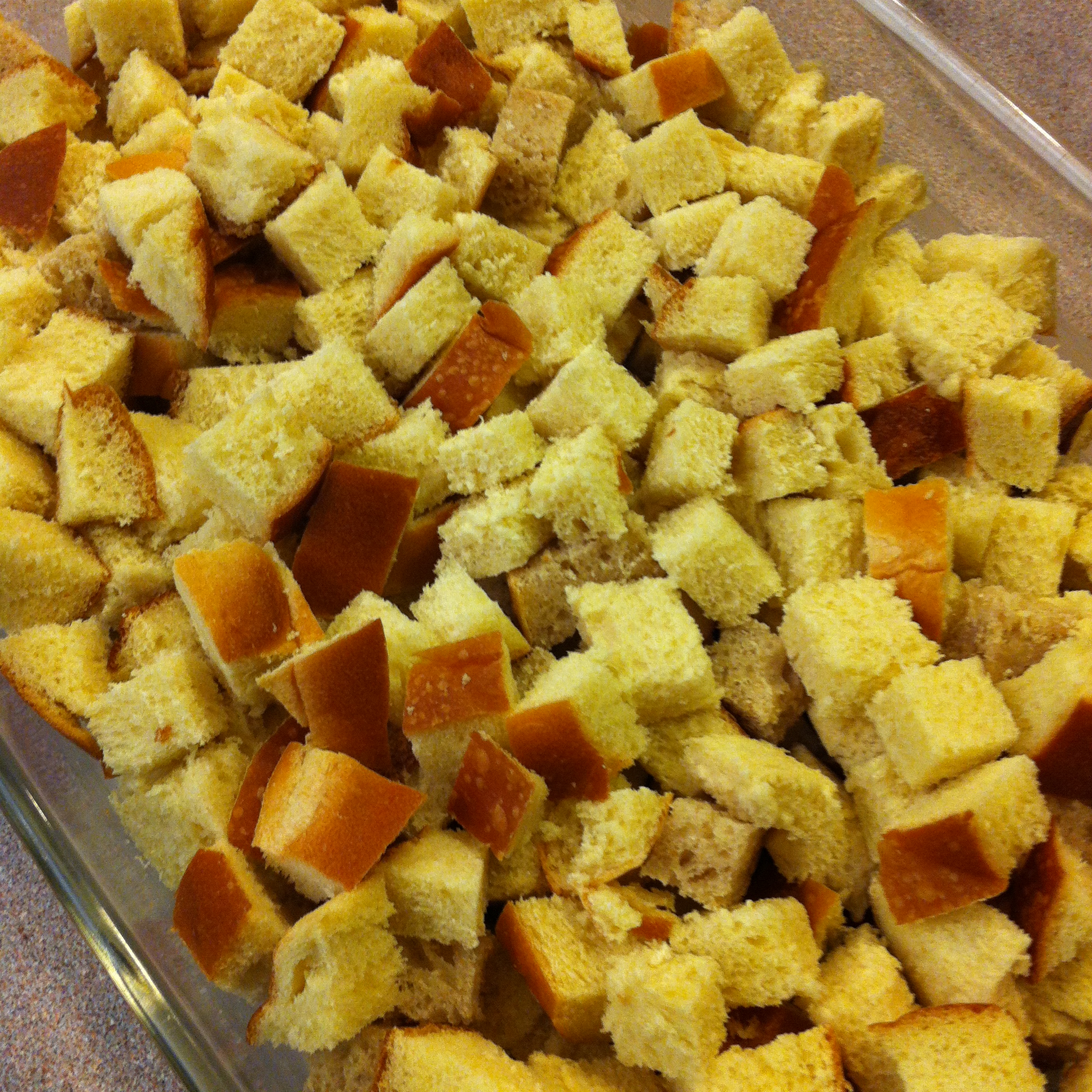 1. Use butter to grease a 9×13 baking pan. Tear or cut up the bread into bite size pieces and evenly distribute them in your pan.