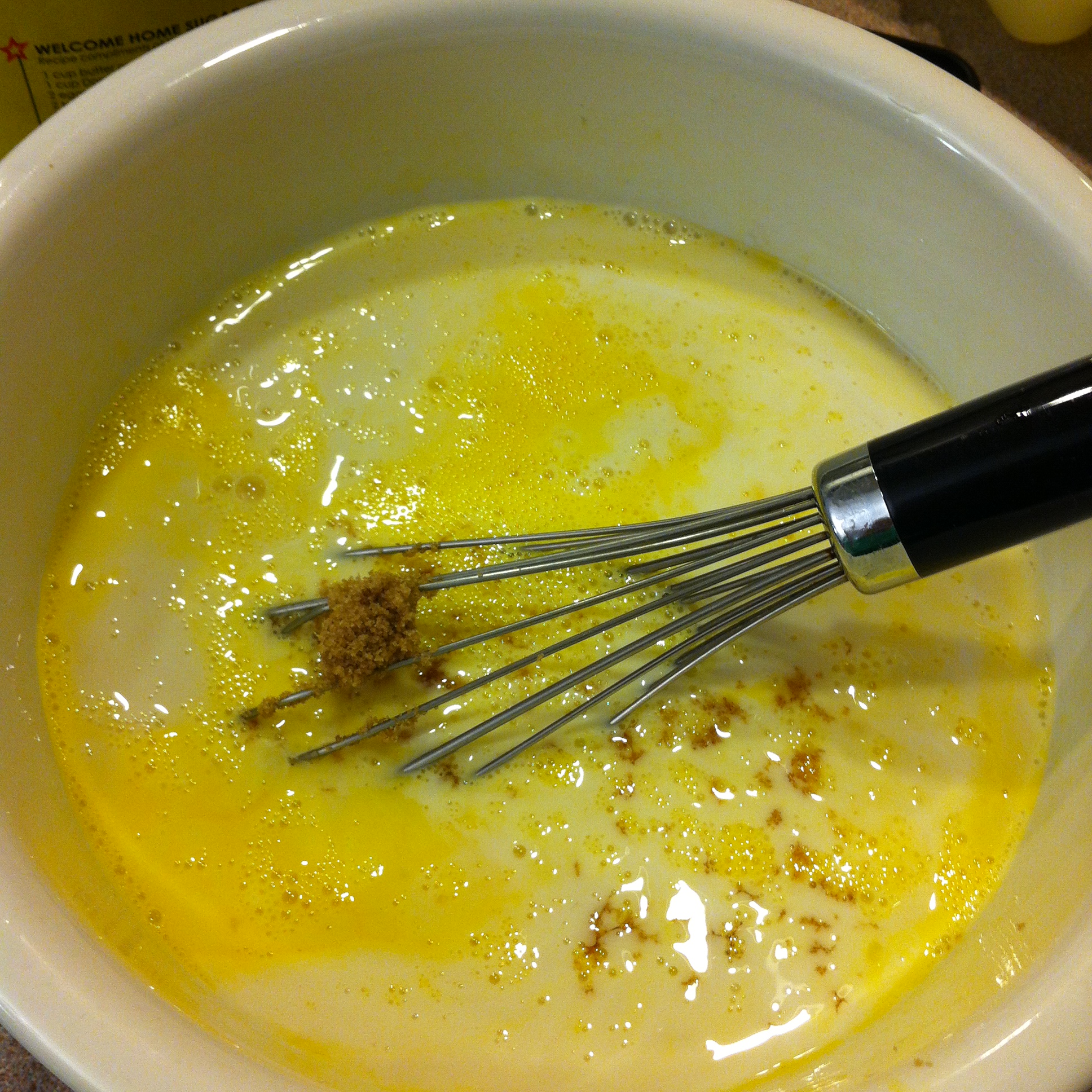 2. In a large bowl, whisk the eggs and add in the milk, creamer, brown sugar, and vanilla. Pour the mixture over the bread pieces. Cover the pan with a lid, foil, or plastic wrap and stick in the fridge until you are ready to bake it.