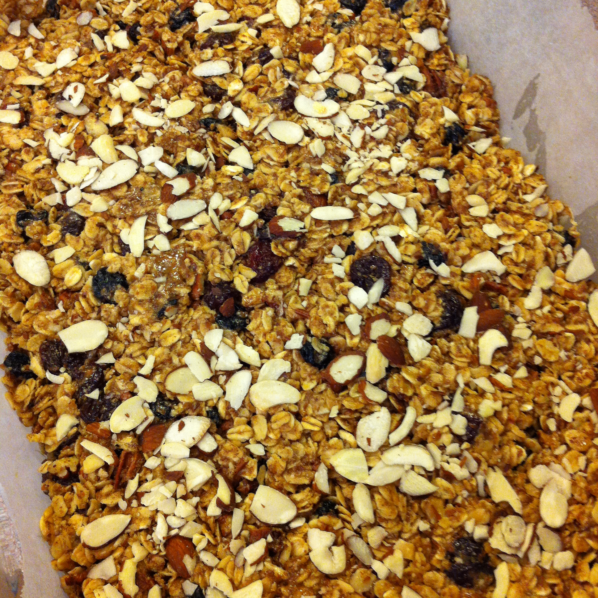 3. In a small saucepan, combine the honey, peanut butter, 2 tablespoons of walnut oil, and vanilla extract. Heat and stir until everything is melted together. Add to the dry ingredients and stir to combine. Dump the mixture into the prepared pan and press it down evenly. Sprinkle the remaining almonds on top of the granola bars. I used some scraps of parchment paper to make sure I could press extra hard without getting anything stuck to me.