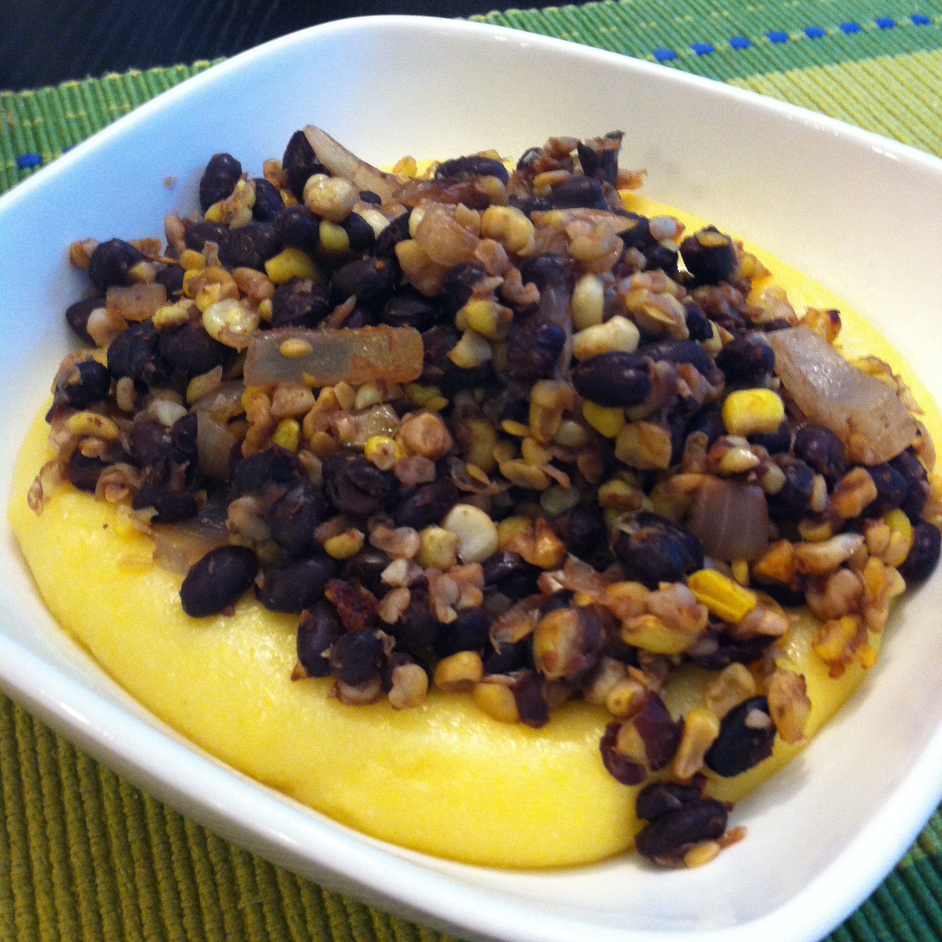 4. After the polenta has finished cooking, stir in the butter and cheese until it has all melted. Serve the bean and corn mixture over a cup of creamy polenta. Salt and pepper to taste.