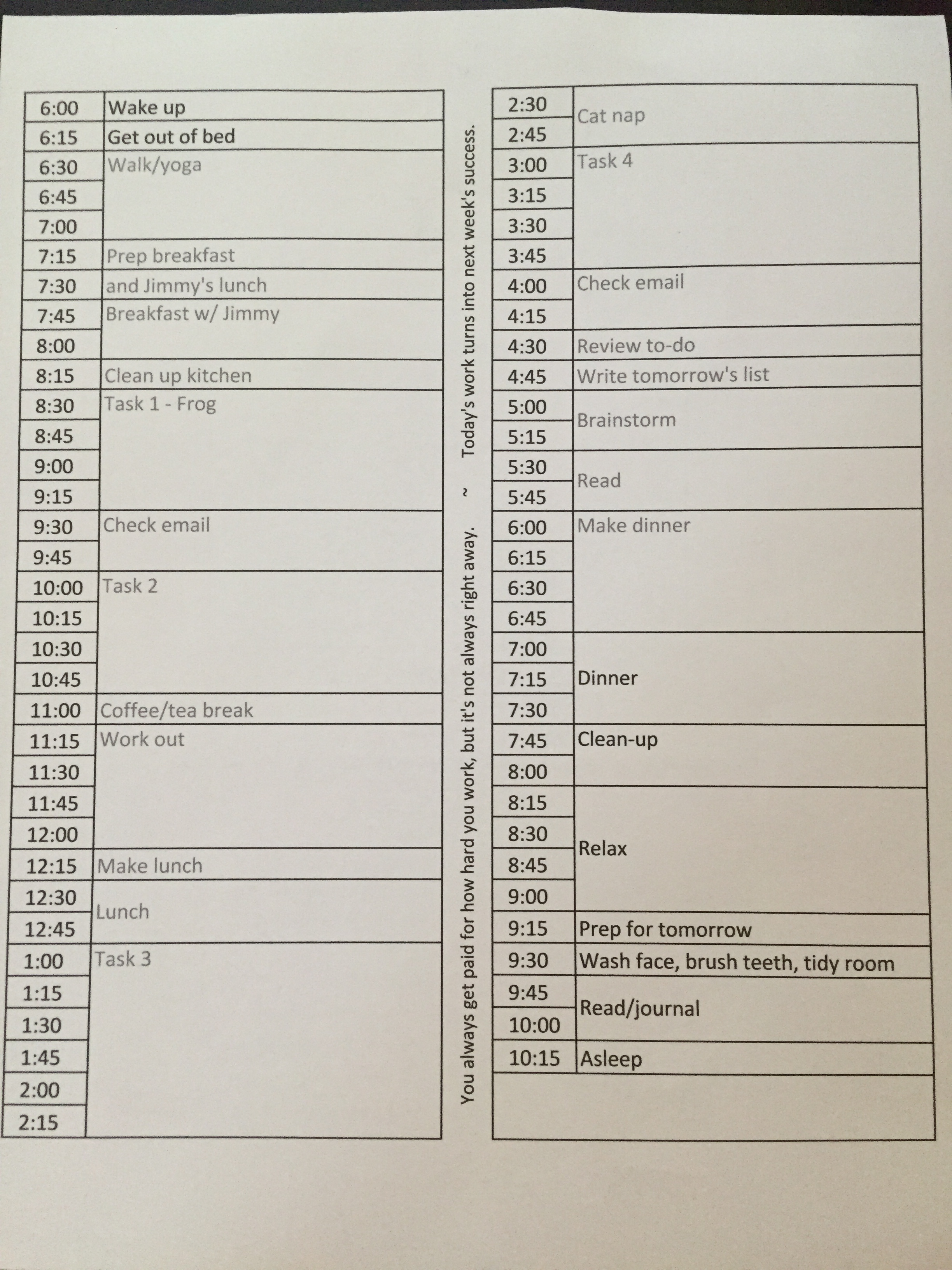 This plan allowed me to set up certain tasks to accomplish, like writing for my blog, cooking or baking elaborate recipes, researching job opportunities, working on contracts, completing household projects, or contribute to volunteer projects.