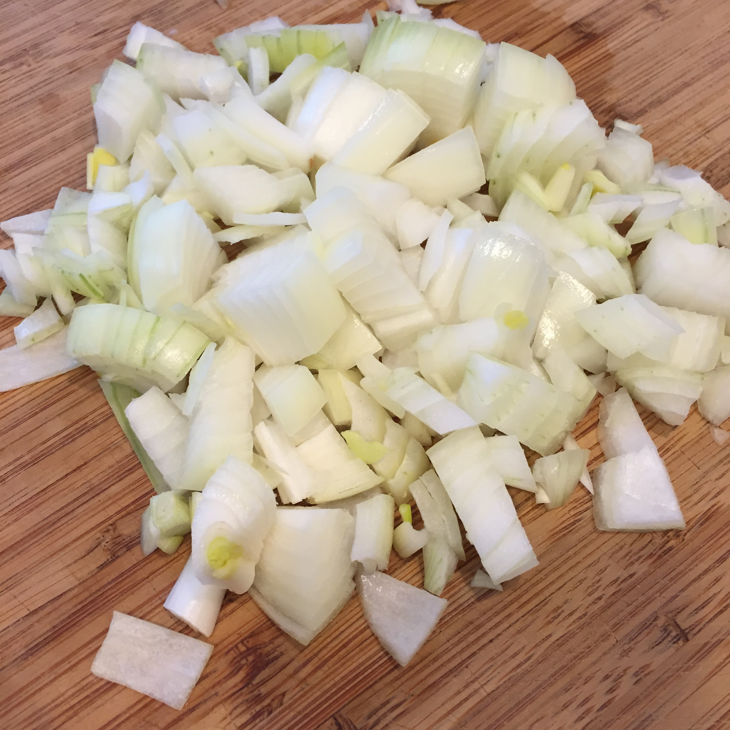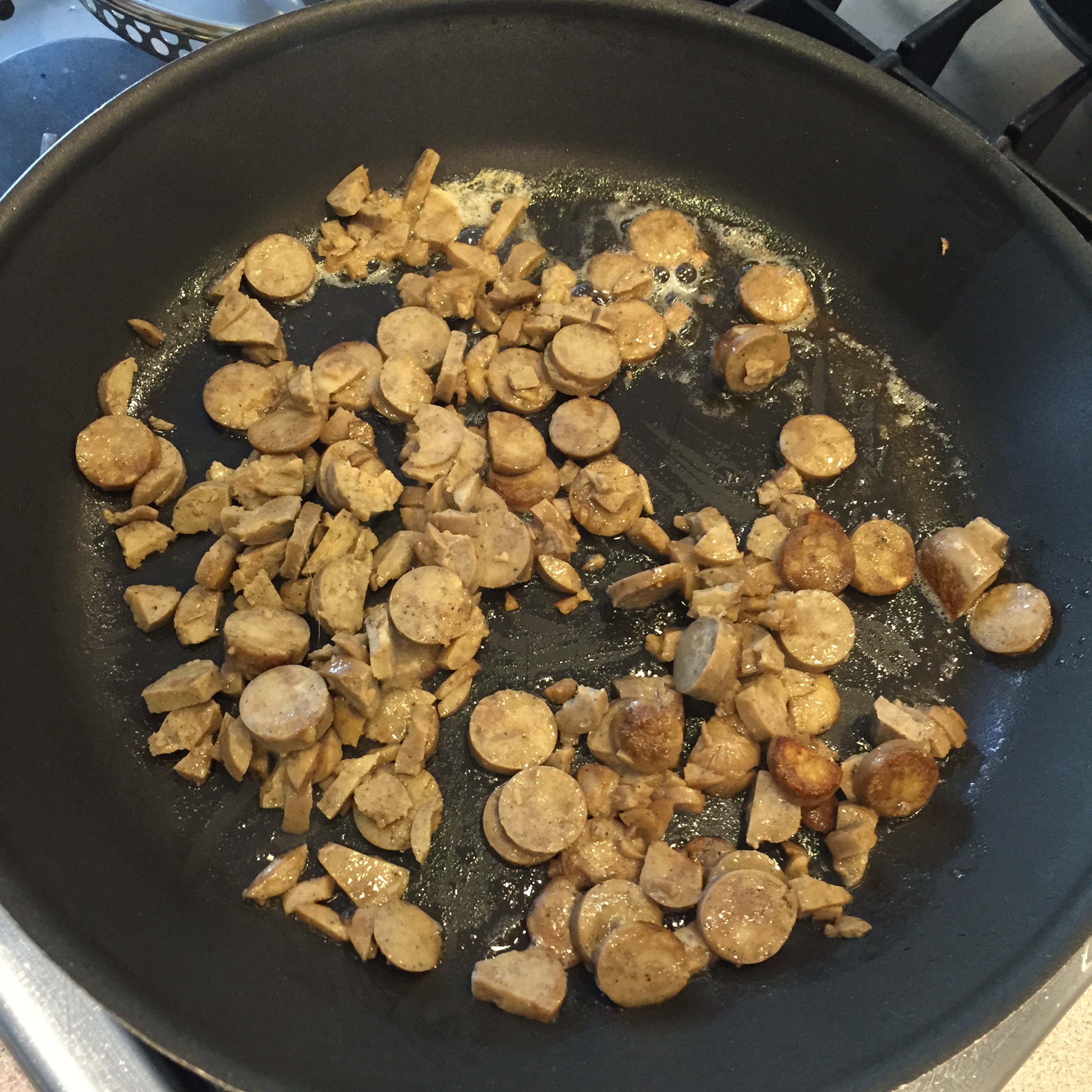 2. Melt 1 tbsp of butter in a large skillet over medium heat. Meanwhile, dice the faux sausage. Saute the sausage in the butter until browned and slightly crispy. While that cooks, dice the onion and mince the garlic. Transfer the sausage to a large bowl.