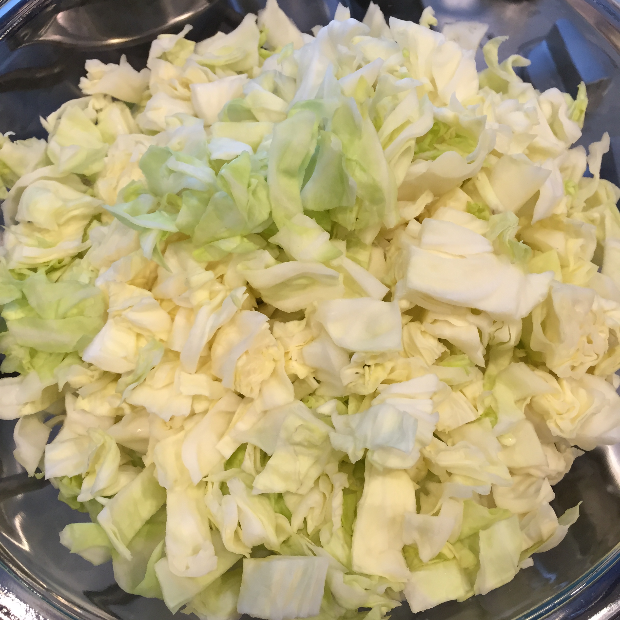 3. Add the other tbsp of butter, onions, and garlic to the hot pan. Slice and dice the cabbage and add it to the onions once the onions are translucent. Cook the cabbage until it is fork-tender. If the cabbage starts to stick or brown too quickly, add a 1/4 cup of water at a time and cover with a lid. Season generously with salt and pepper.