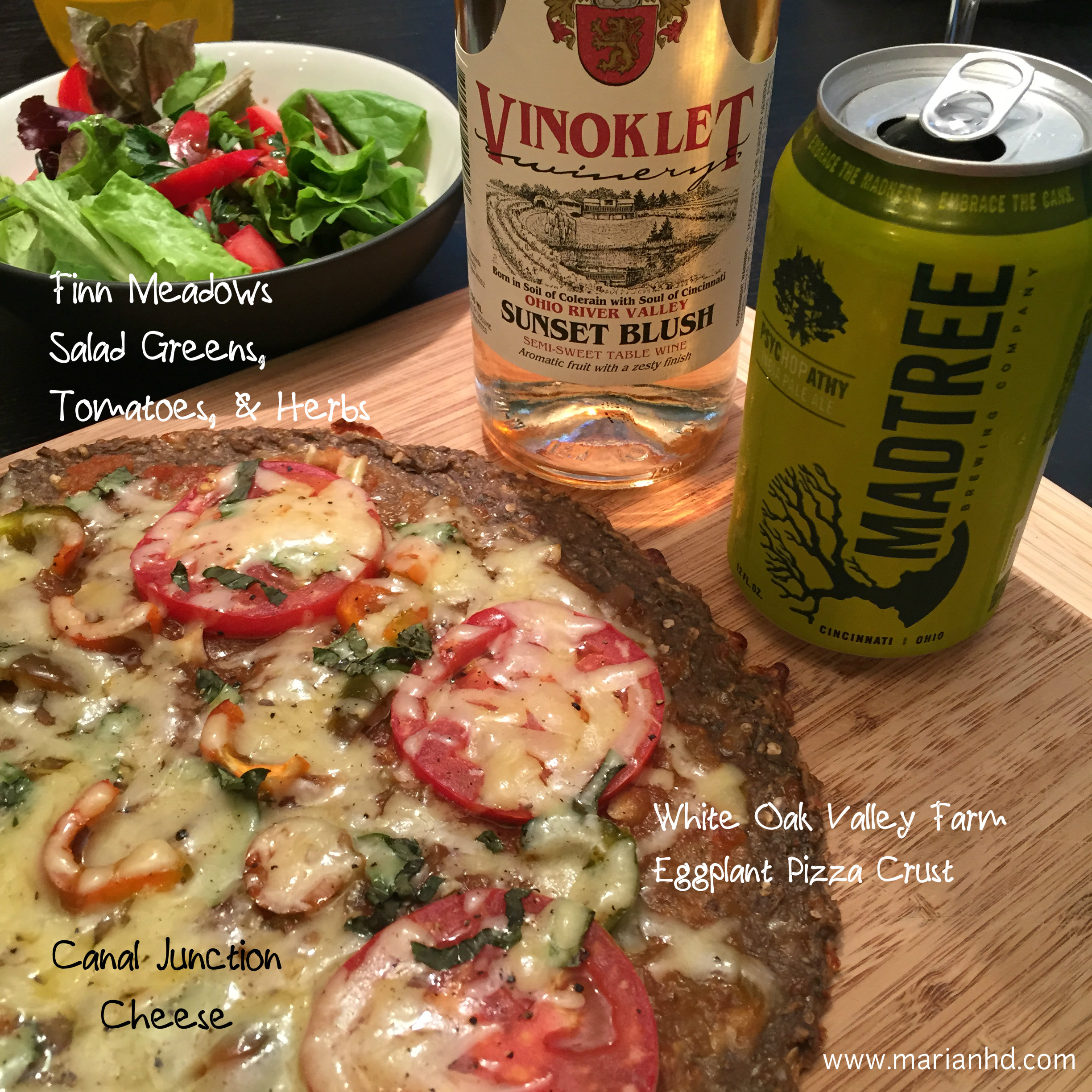 Dinner Day 1. Pizza and local booze! The crust is made with eggplant by a local farm. Another local salad, local beer for the husband, and local wine for me!
