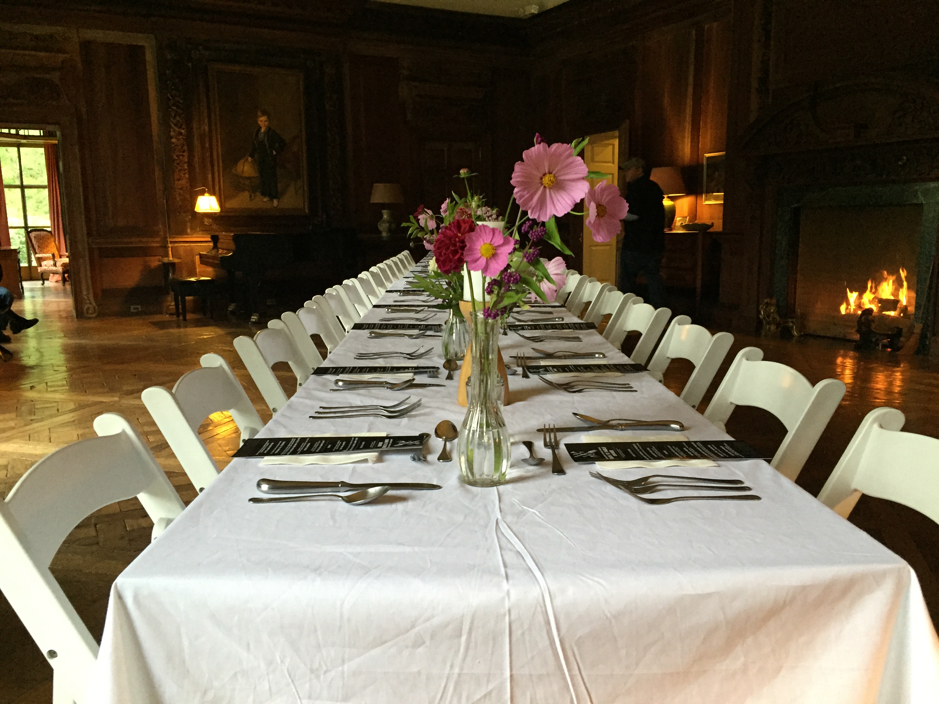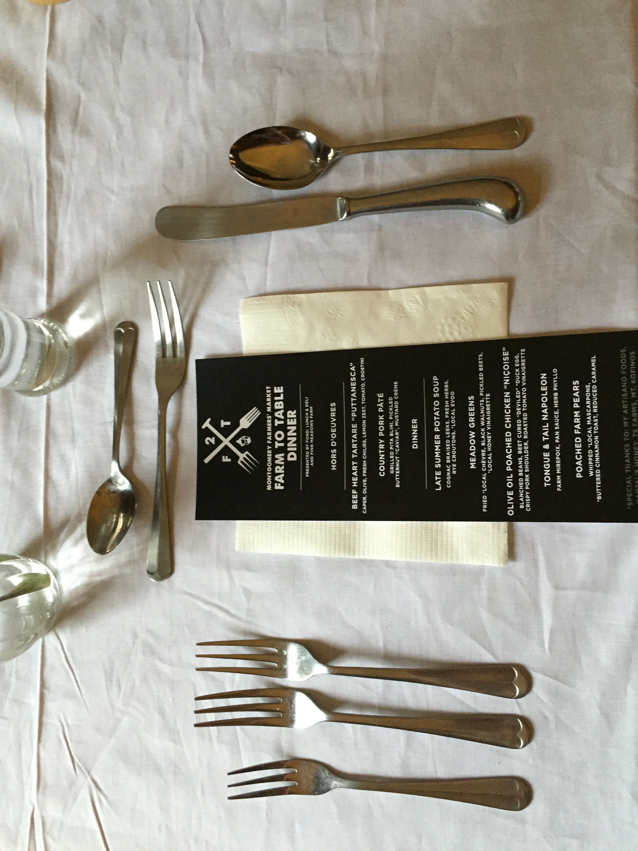 Dinner Day 3: Sometimes it really pays to volunteer. My farmers’ market threw a 5-course Farm to Table Dinner as a fundraiser. Being a board member, I worked my butt off helping to organize it (I even made us custom table cloths!). Three of the board members plus spouses served the food, tended bar, and cleaned up, with the gracious support of the staff at Peterloon (our rain location).