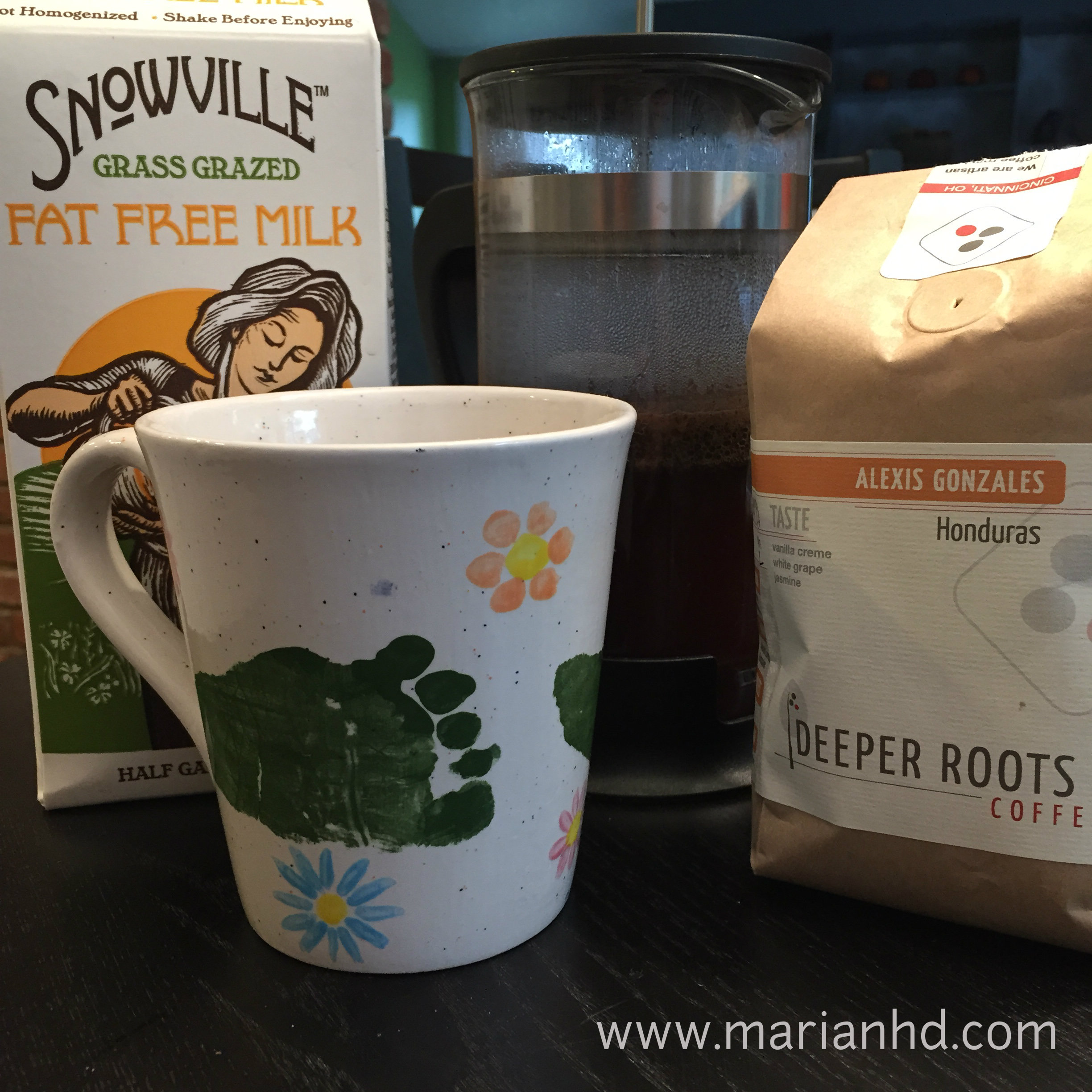It pairs nicely with some Snowville Creamery milk. I’ve been trying to kick my sugar habit, but if I need a little sweetness I use some of Kartal’s Honey. A hand-painted mug with my son’s footprint on it makes coffee even better, too.